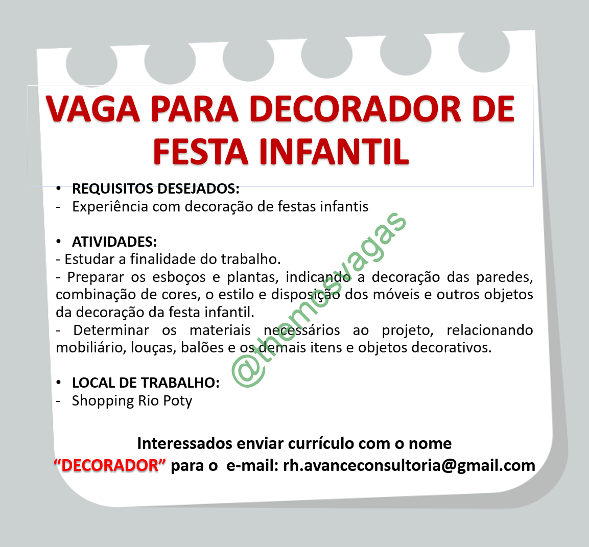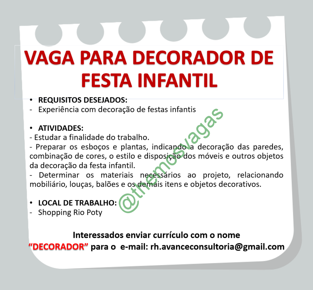 – Interessados(as) e que atendam ao perfil solicitado acima, devem enviar o currículo para o e-mail rh.avanceconsultoria@gmail.com contendo no título/assunto “Decorador THE”.