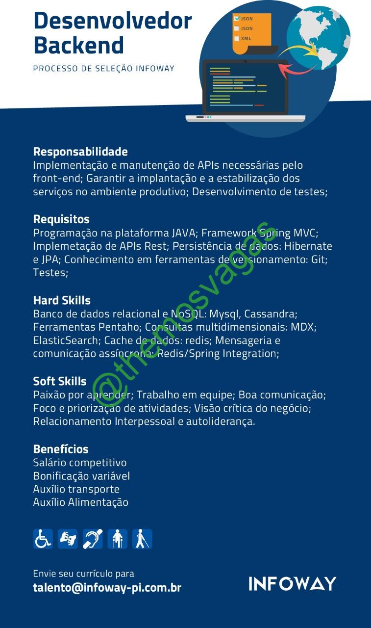 – Interessados(as) e que atendam ao perfil solicitado acima, devem enviar o currículo para o e-mail talento@infoway-pi.com.br contendo no título/assunto “Desenvolvedor Backend THE“.