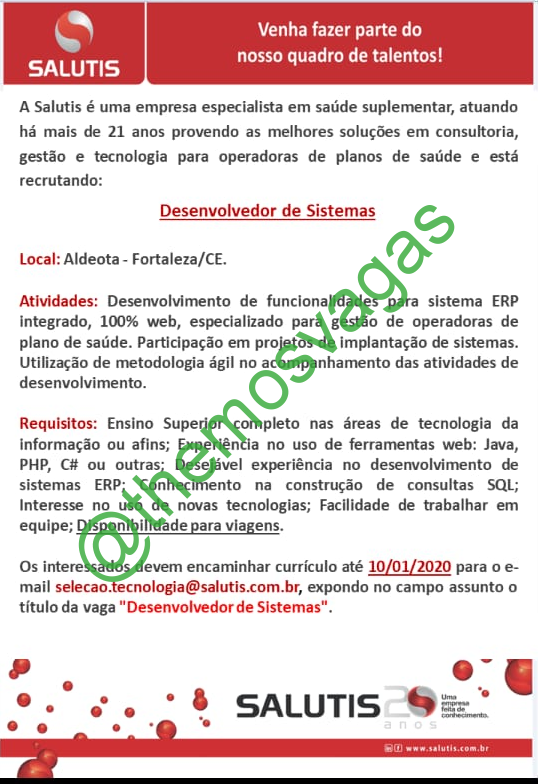 – Interessados(as) e que atendam ao perfil solicitado acima, devem até o dia 10/01/2020 enviar o currículo para o e-mail selecao.tecnologia@salutis.com.br , colocando no título “Desenvolvedor de Sistemas”.
