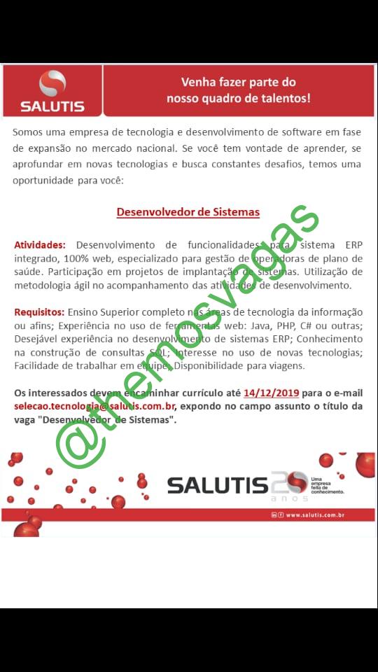 – Interessados(as) e que atendam ao perfil solicitado acima, devem até o dia 14/12/2019 enviar o currículo para o e-mail selecao.tecnologia@salutis.com.br , colocando no título “Desenvolvedor de Sistemas”.