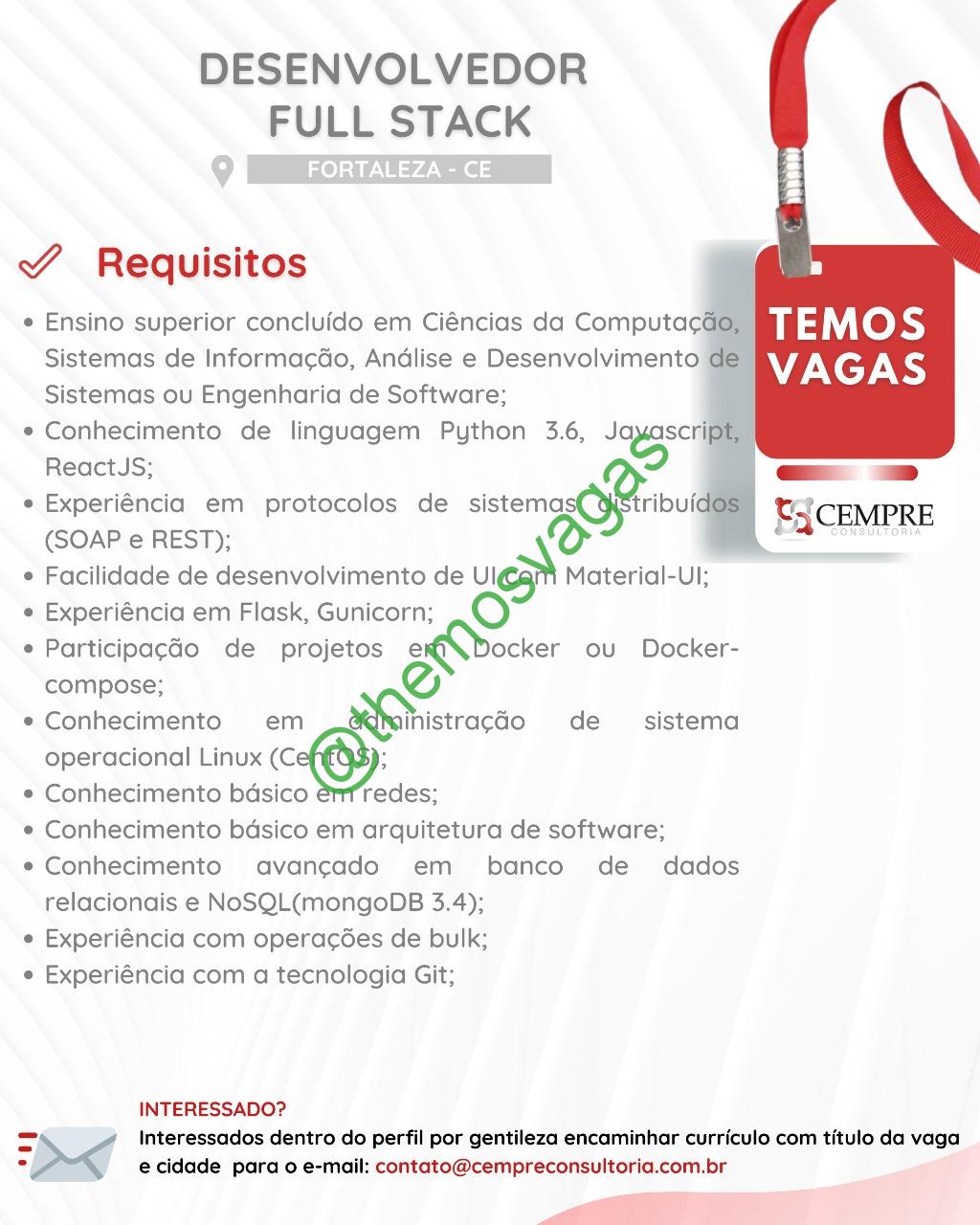 ---------- ATENÇÃO: Essa vaga é de responsabilidade do anunciante. Fique atento para possíveis golpes. Se perceber algo suspeito, nos comunique através do e-mail floromauel@gmail.com colocando no título "Themos Vagas - Denúncia" juntamente com o link da publicação e o motivo da denúncia na descrição da mensagem para que possamos analisar e parar de divulgar o anúncio. ----------