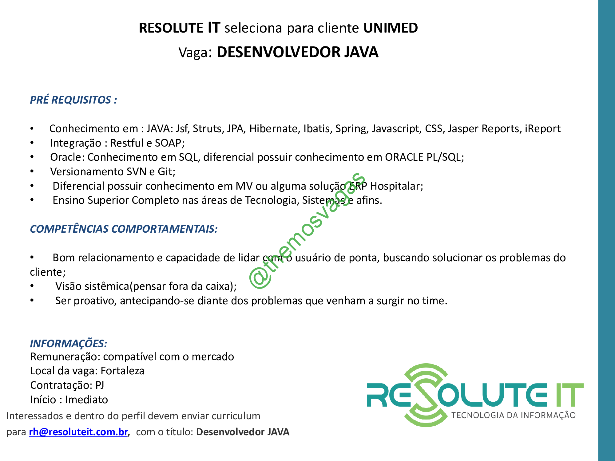 – Interessados(as) e que atendam ao perfil solicitado acima, devem enviar o currículo para o e-mail rh@resoluteit.com.br , colocando no título “Desenvolvedor Java”.