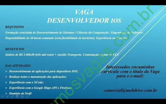 Interessados(as) e que atendam aos requisitos exigidos na imagem acima devem enviar o perfil profissional, contendo no título/assunto do e-mail “Desenvolvedor IOS”, para comercial@mobdrive.com.br .