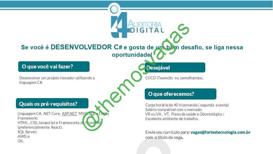 – Interessados(as) e que atendam ao perfil solicitado acima, devem enviar o currículo para o e-mail vagas@fortestecnologia.com.br , colocando no título “Desenvolvedor(a) C”.