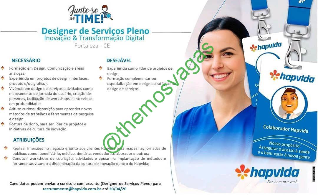 – Interessados(as) e que atendam ao perfil solicitado acima, devem até o dia 30/04/2020 enviar o currículo para o e-mail recrutamento@hapvida.com.br , colocando no título “Designer de Serviços Pleno”.