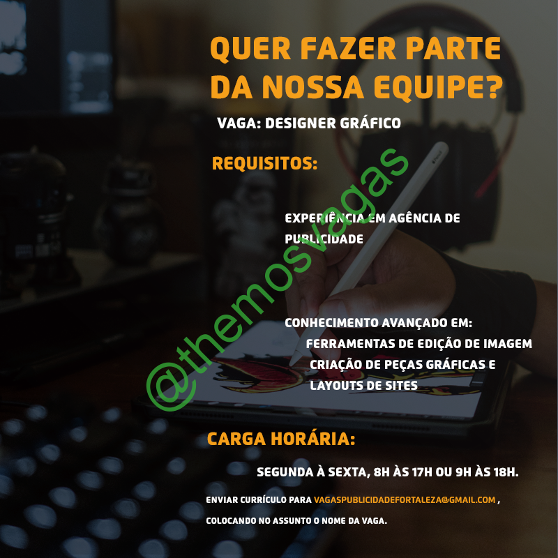 – Interessados(as) e que atendam ao perfil solicitado acima, devem enviar o currículo para o e-mail vagaspublicidadefortaleza@gmail.com , colocando no título “Designer Gráfico”.