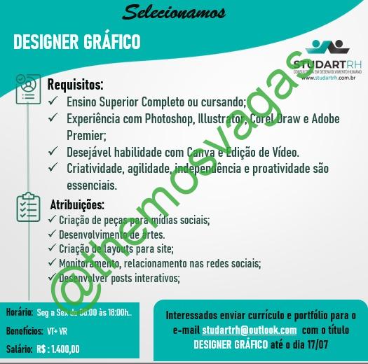 – Interessados(as) e que atendam ao perfil solicitado acima, devem até o dia 17/07/2020 enviar o currículo para o e-mail studartrh@outlook.com , colocando no título “DESIGNER GRÁFICO”.