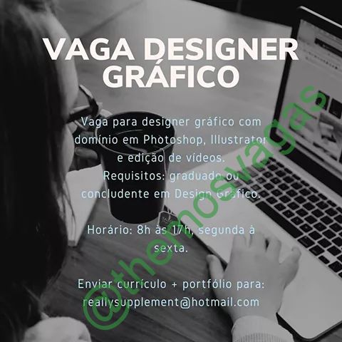 – Interessados(as) e que atendam ao perfil solicitado acima, devem enviar o currículo e portfólio para o e-mail reallysupplement@hotmail.com, colocando no título “Designer Gráfico”.