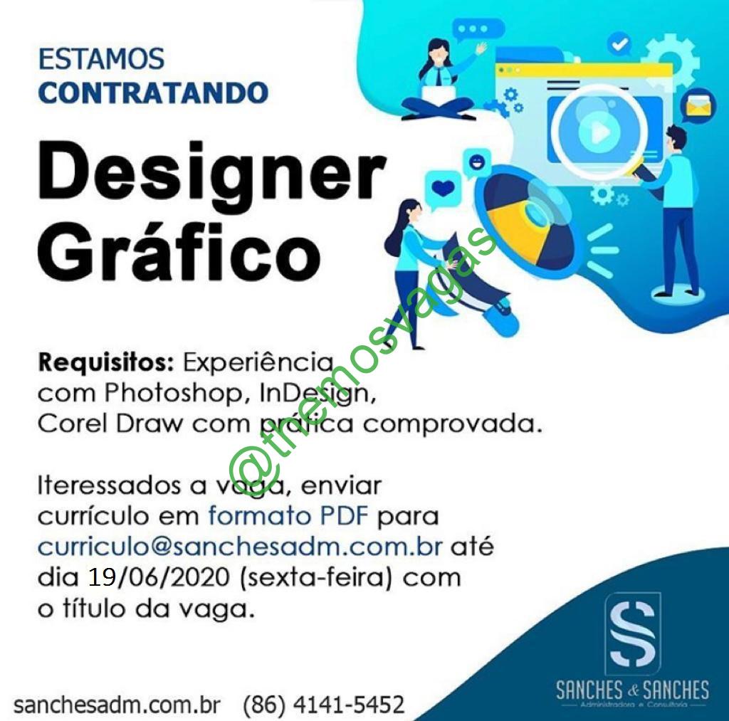 – Interessados(as) e que atendam ao perfil solicitado acima, devem enviar o currículo até 19/06/2020 para o e-mail curriculo@sanchesadm.com.br contendo no título/assunto “Designer Gráfico THE