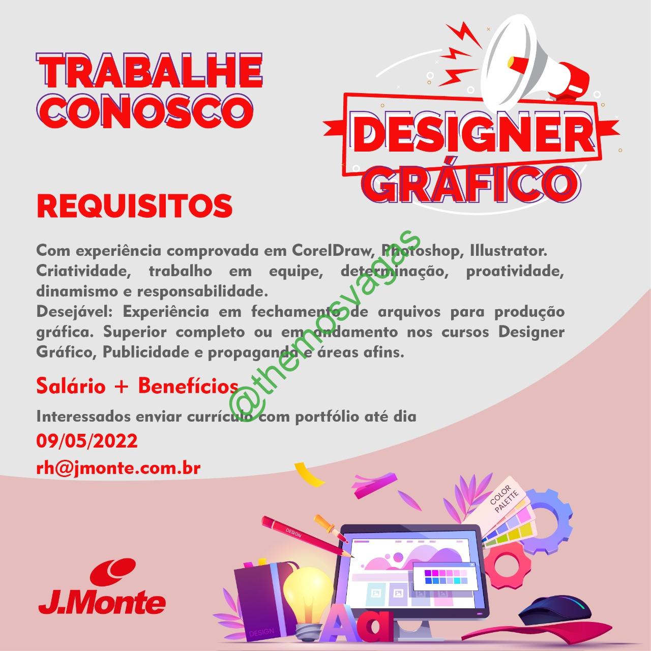 – Interessados(as) e que atendam ao perfil solicitado acima, devem enviar o currículo com portifólio até 09/05/2022  para o e-mail rh@jmonte.com.br contendo no título/assunto “Designer Gráfico THE