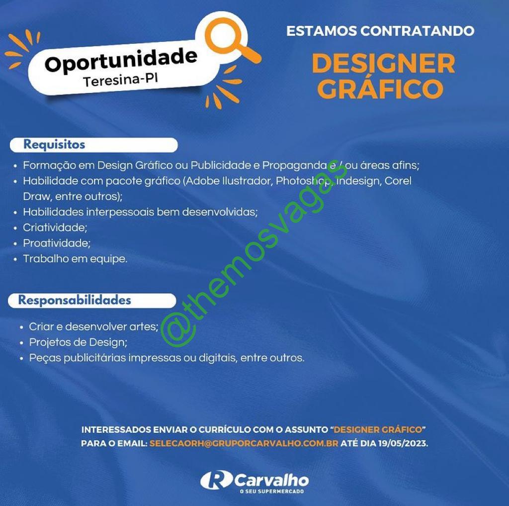 – Interessados(as) e que atendam ao perfil solicitado acima, devem enviar o currículo até 19/05/2023 para o e-mail selecaorh@grupocarvalho.com.br contendo no título/assunto “Designer Gráfico”.