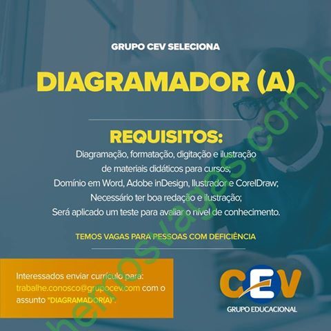 Interessados(as) e que atenda aos requisitos exigidos na imagem acima devem enviar o perfil profissional, contendo no título/assunto do e-mail “Diagramdor(a)”, para trabalhe.conosco@grupocev.com .