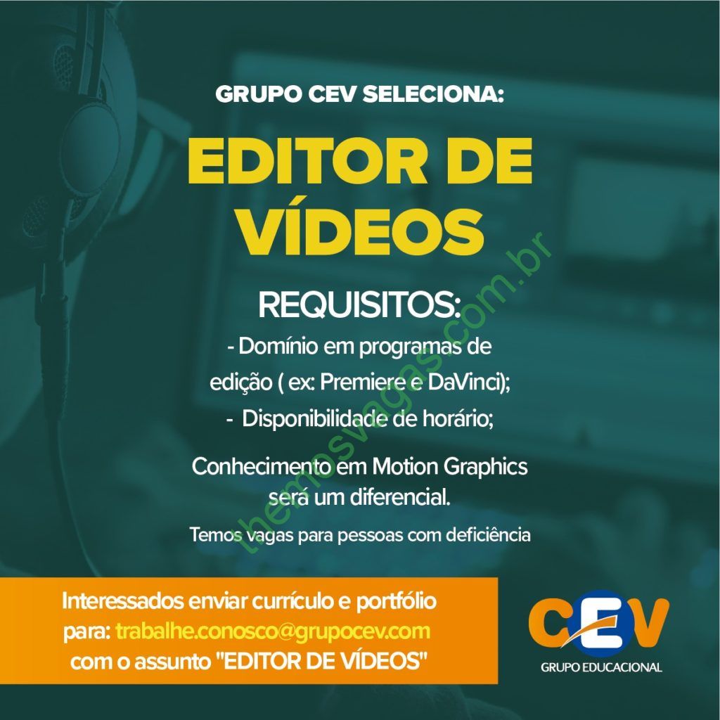 – Interessados(as) e que atendam ao perfil solicitado acima devem enviar o currículo para o e-mail trabalhe.conosco@grupocev.com contendo no título “Editor de Vídeos“.