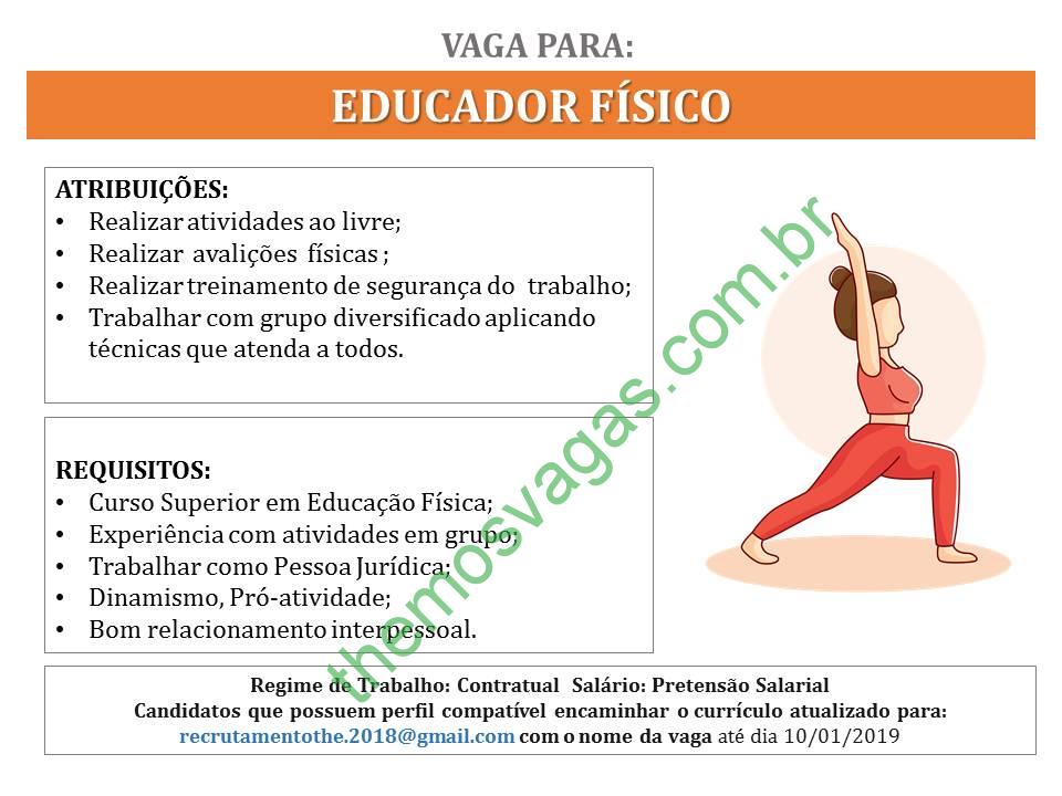 Interessados(as) e que atendam aos requisitos exigidos na imagem acima devem enviar o perfil profissional com a pretensão salarial até 10/01/2019, contendo no título/assunto do e-mail “Educador(a) Físico(a)”, para recrutamentothe.2018@gmail.com .