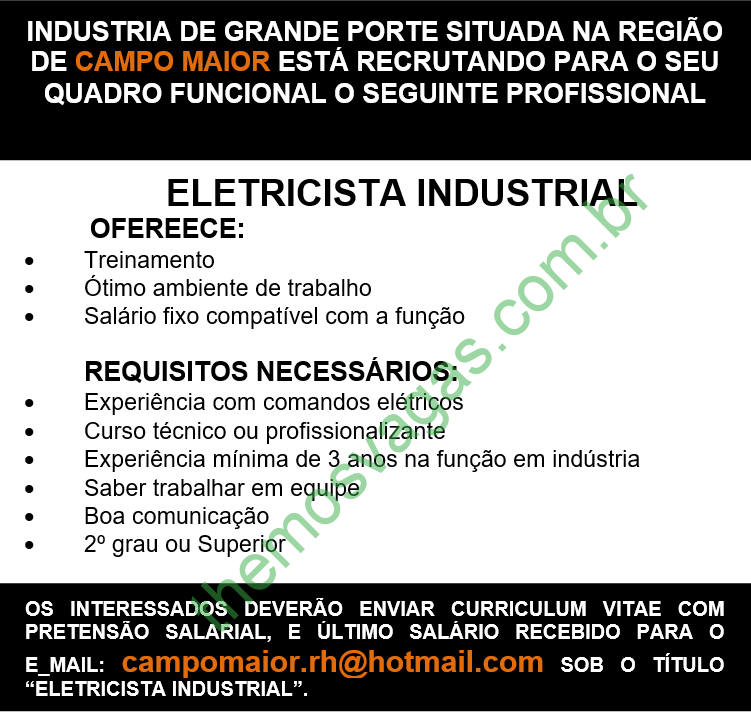 Interessados(as) e que atendam aos requisitos devem enviar o perfil profissional, colocando no título do e-mail “Eletricista Industrial”,  para: campomaior.rh@hotmail.com