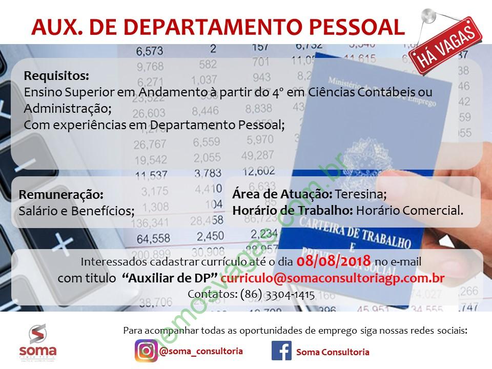 Interessados(as) e que atendam aos requisitos exigidos na imagem acima devem enviar o perfil profissional até 08/08/2018, colocando no título do e-mail “Auxiliar de DP” para: curriculo@somaconsultoriagp.com.br .