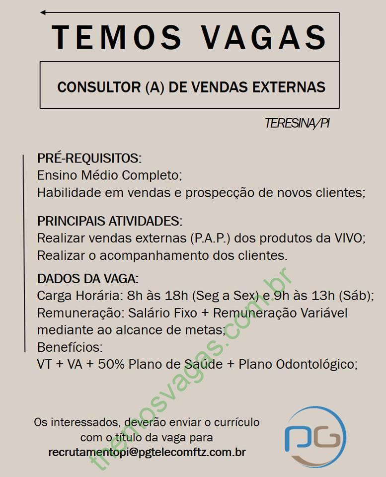 Interessados(as) e que atendam aos requisitos devem enviar o perfil profissional, colocando no título do e-mail “Consultor(a) de Vendas Externas”, para: recrutamentopi@pgtelecomftz.com.br