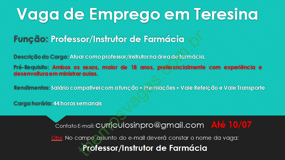 Emprego para Professor de Farmácia em Teresina – PI