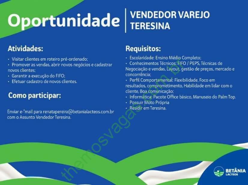 Emprego para Vendedor de Varejo na Betânia Lacteos em Teresina – PI