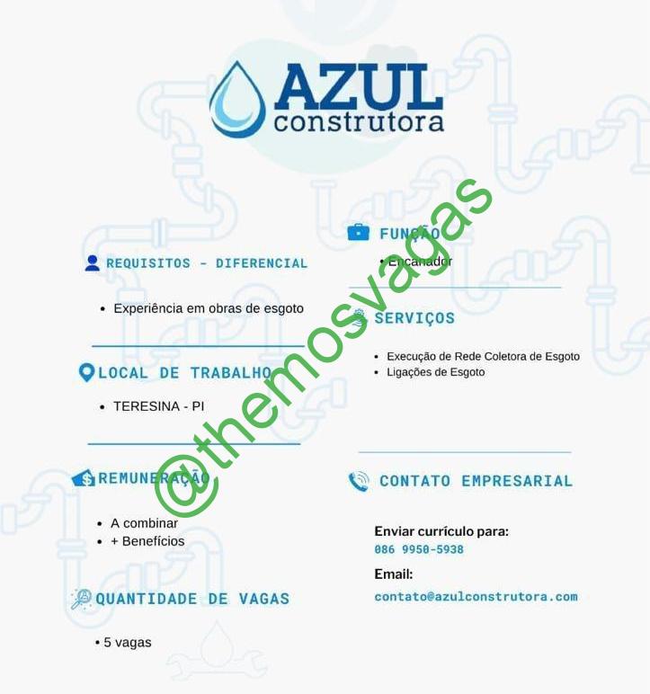 – Interessados(as) e que atendam ao perfil solicitado acima, devem enviar o currículo para o e-mail contato@azulconstrutora.com contendo no título/assunto “Encanador – THE“ ou através do telefone/whats (86) 9950-5938.