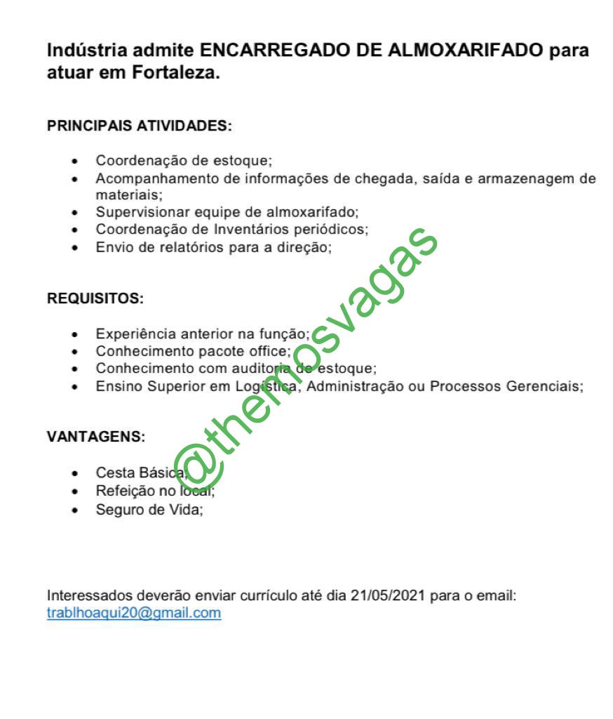 – Interessados(as) e que atendam ao perfil solicitado acima, devem enviar o currículo para o e-mail trabalhoaqui20@gmail.com, contendo no título/assunto “Encarregado de Almoxarifado FOR“.