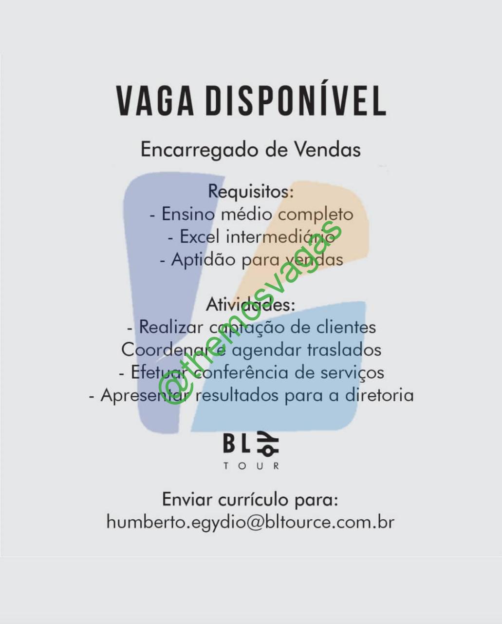 – Interessados(as) e que atendam ao perfil solicitado acima, devem enviar o currículo para o e-mail humberto.egydio@bltource.com.br, contendo no titulo/assunto “Encarregado de Venda – FOR