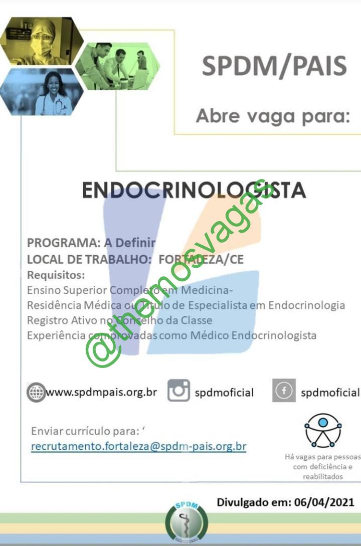 – Interessados(as) e que atendam ao perfil solicitado acima, devem enviar o currículo até 06/04/2021  para o e-mail  recrutamento.fortaleza@spdm-pais.org.br, contendo no título/assunto “Endocrinologista – FOR ”.