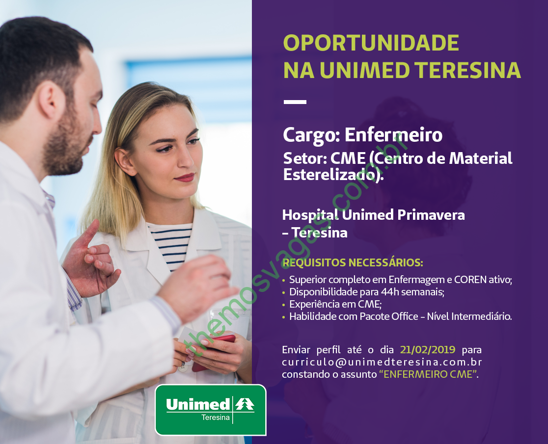 Interessados(as) e que atendam aos requisitos exigidos na imagem acima devem enviar o perfil profissional até 21/02/2019, contendo no título/assunto do e-mail “Enfermeiro CME”, para curriculo@unimedteresina.com.br .
