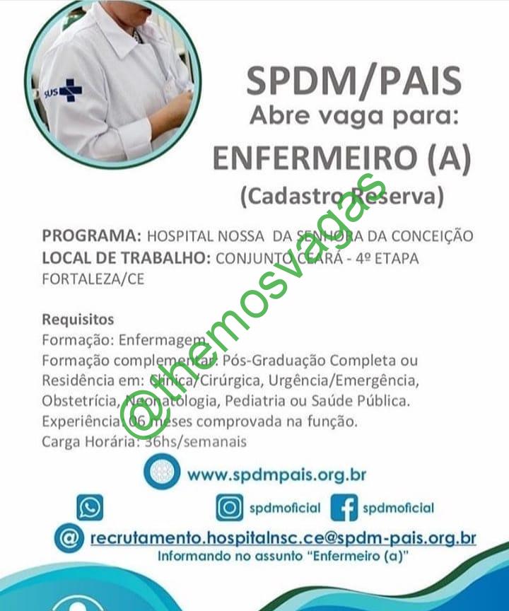 – Interessados(as) e que atendam ao perfil solicitado acima, devem enviar o currículo para o e-mail recrutamento.hospitalnsc.ce@spdm-pais.or.br , colocando no título “Enfermeiro(a) Cadastro de Reserva”.
