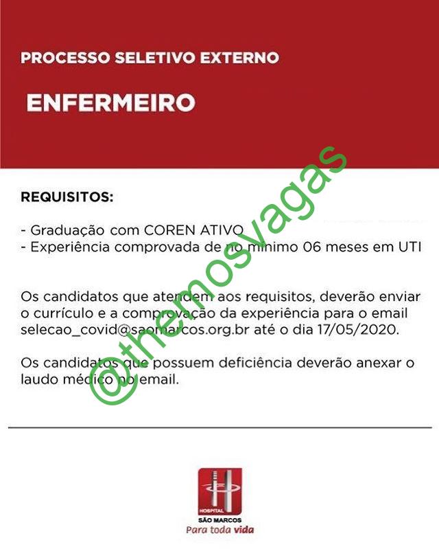 – Interessados(as) e que atendam ao perfil solicitado acima devem enviar o currículo até 17/05/2020 para o e-mail selecao_covid@saomarcos.org.br , contendo no título/assunto “Enfermeiro(a) Covid THE“.