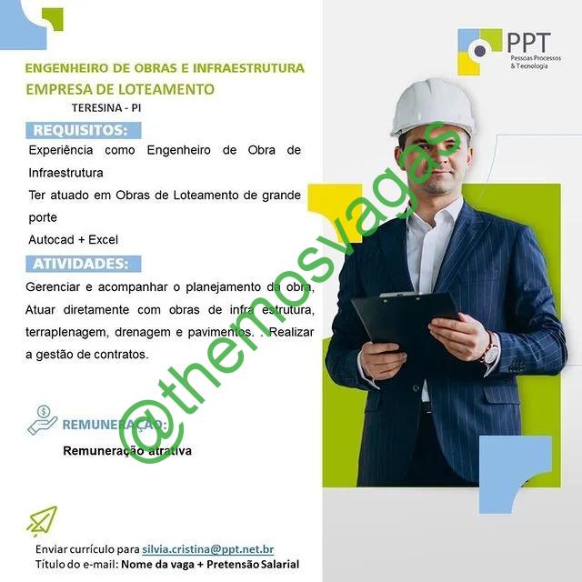 – Interessados(as) e que atendam ao perfil solicitado acima, devem enviar o currículo para o e-mail silvia.cristina@ppt.net.br, contendo no título/assunto “Engenheiro de Obras e Infraestrutura (Pretensão Salarial)- THE“.