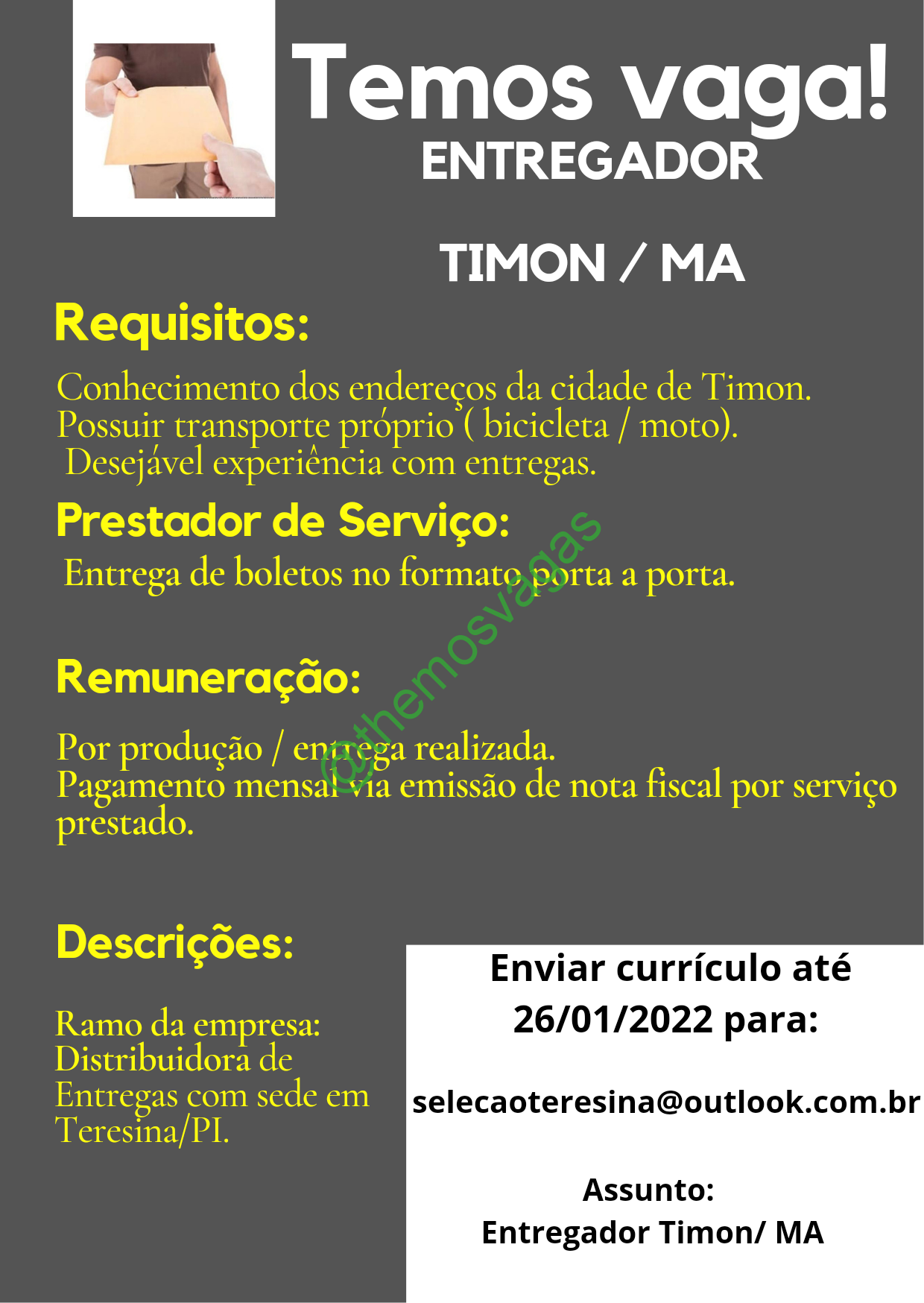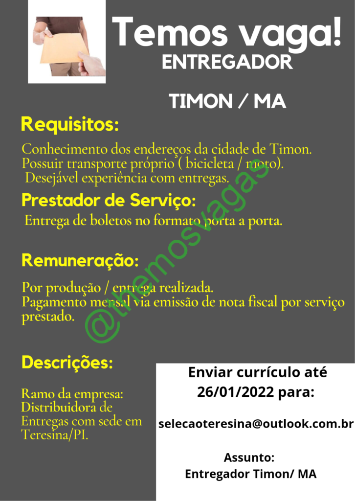– Interessados(as) e que atendam ao perfil solicitado acima, devem enviar o currículo para o e-mail selecaoteresina@outlook.com.br contendo no título/assunto “Entregador – Timon/MA