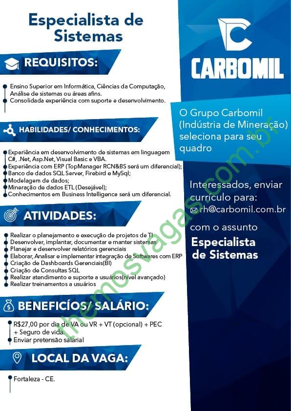 – Interessados(as) e que atendam ao perfil solicitado acima, devem enviar o currículo para o e-mail rh@carbomil.com.br colocando no título “Especialista de Sistemas”.