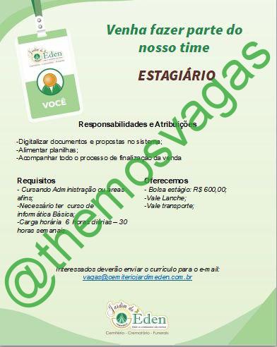 – Interessados(as) e que atendam ao perfil solicitado acima, devem enviar o currículo para o e-mail vagas@cemiteriojardimeden.com.br, contendo no titulo/assunto “Estagiário(a) – FOR