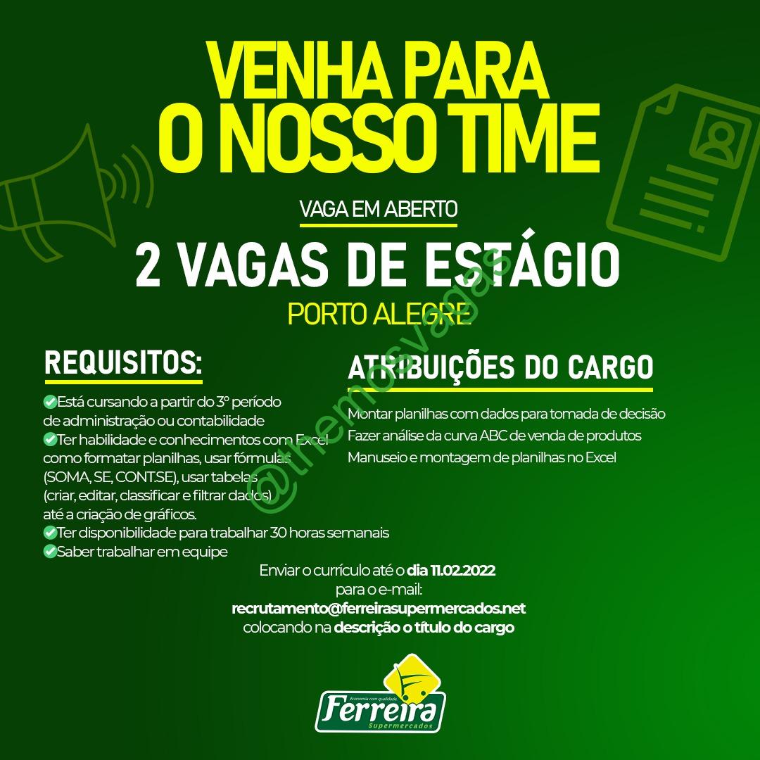 – Interessados(as) e que atendam ao perfil solicitado acima, devem enviar o currículo até 11/02/2022  para o e-mail recrutamento@ferreirasupermercados.net contendo no título/assunto “Estágio THE