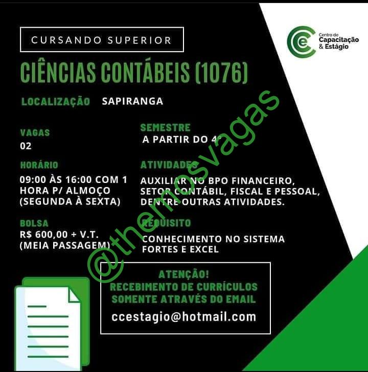 – Interessados(as) e que atendam ao perfil solicitado acima, devem enviar o currículo para o e-mail ccestagio@hotmail.com, contendo no título/assunto “Estágio Contábil – FOR