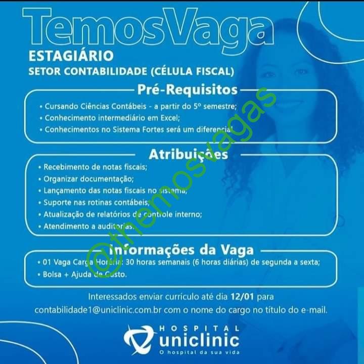 – Interessados(as) e que atendam ao perfil solicitado acima, devem até o dia 12|01|2021 enviar o currículo para o e-mail contabilidade1@uniclic.com.br, contendo no título/assunto “Estágio Contabilidade – FOR“.