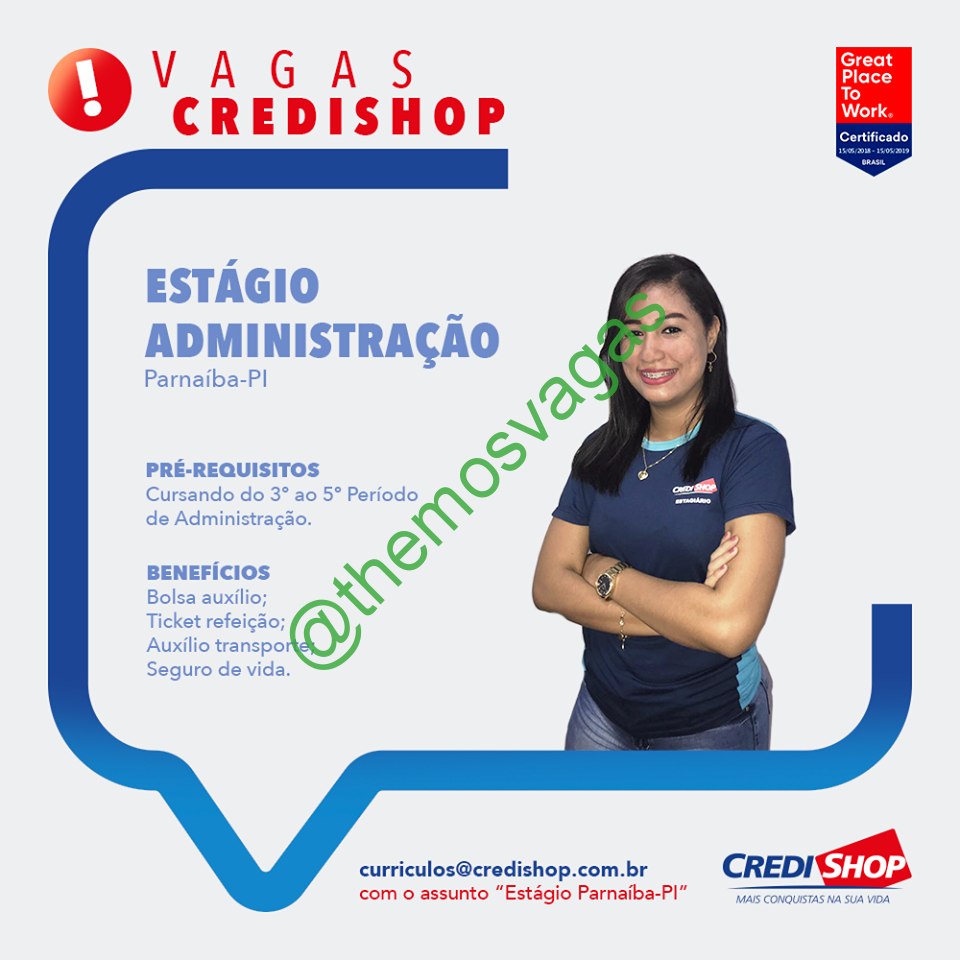 – Interessados(as) e que atendam ao perfil solicitado acima, devem enviar o currículo para o e-mail curriculos@credishop.com.br contendo no título/assunto “Estágio Parnaíba-PI“.