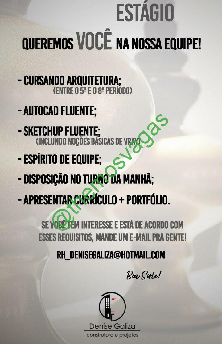 – Interessados(as) e que atendam ao perfil solicitado acima, devem enviar o currículo para o e-mail rh_denisegaliza@hotmail.com contendo no título/assunto “Estágio de Arquitetura THE