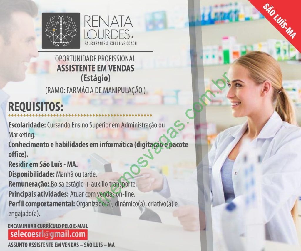 – Interessados(as) e que atendam aos requisitos devem enviar o perfil profissional, colocando no título do e-mail “Assistente de Vendas – São Luís – MA”, para: selecoesrl@gmail.com