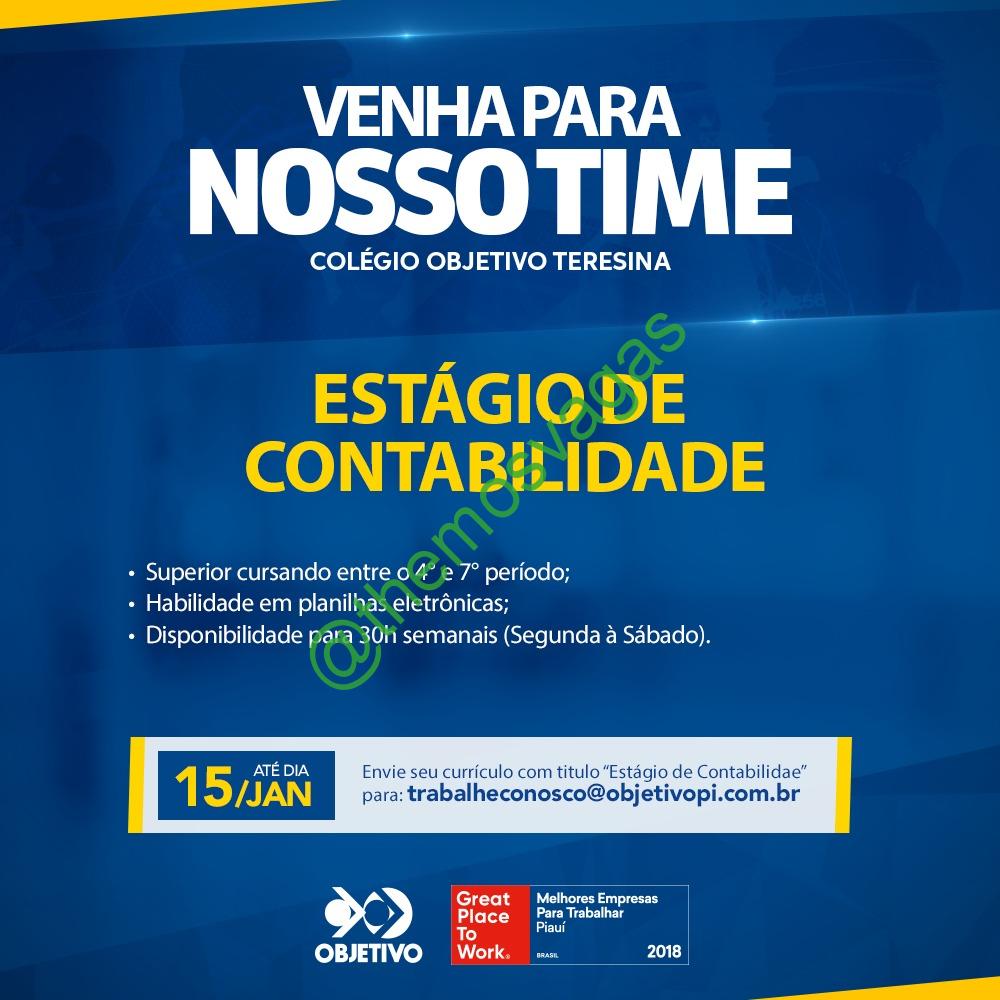 – Interessados(as) e que atendam ao perfil solicitado acima, devem enviar o currículo até 15/01/2020 para o e-mail trabalheconosco@objetivopi.com.br , colocando no título/assunto: “Estágio de Contabilidade”.