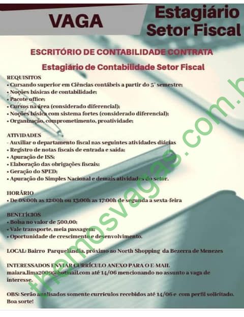 – Interessados(as) e que atendam ao perfil solicitado acima, devem enviar o currículo para o e-mail maiara.lima2009@hotmail.com até o dia 14/06/2019 , colocando no título “Estágio de Contabilidade – Setor Fiscal”.