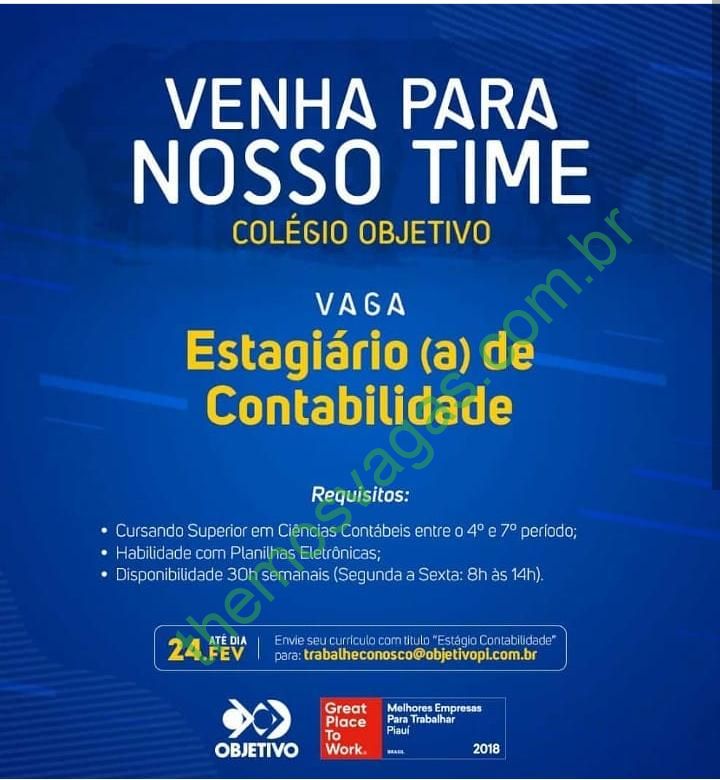 Interessados(as) e que atendam aos requisitos devem enviar o perfil profissional até o dia 24/02/2019, colocando no título do e-mail “Estágio de Contabilidade”, para: trabalheconosco@objetivopi.com.br