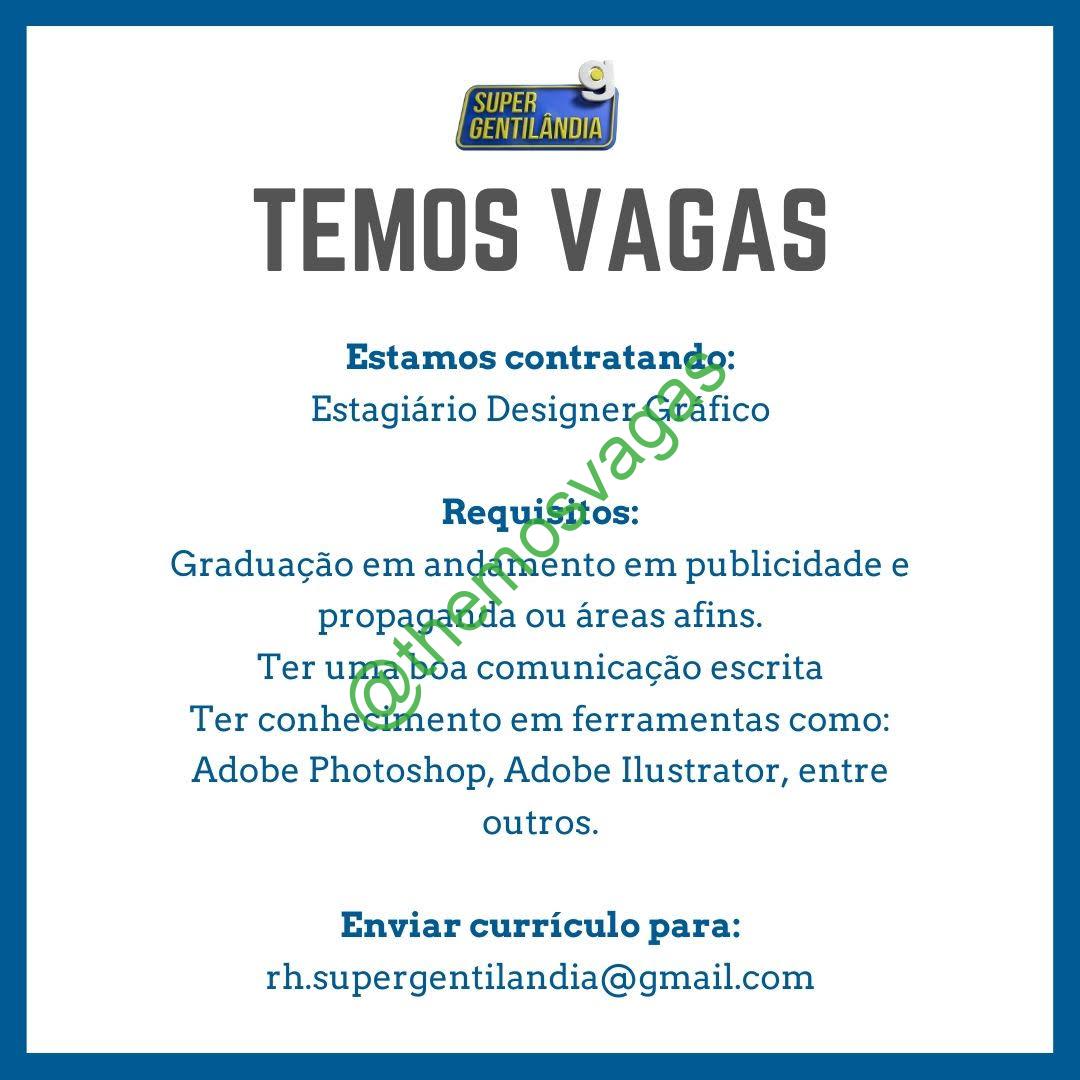 – Interessados(as) e que atendam ao perfil solicitado acima, devem enviar o currículo para o e-mail rh.supergentilandia@gmail.com , colocando no título “Estágio de Designer Gráfico”.