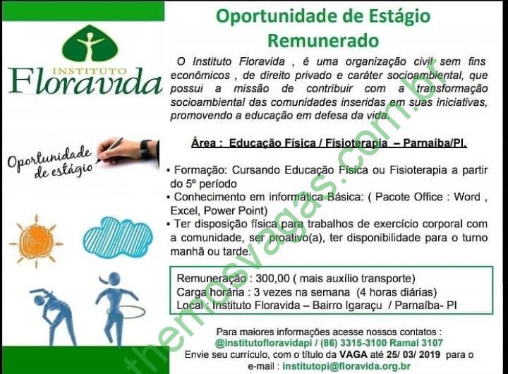 Interessados(as) e que atendam aos requisitos da imagem acima devem enviar o perfil profissional colocando no título/assunto do e-mail: “VAGA”, para institutopi@floravida.org.br até o dia 25/03/2019. Para Maiores informações entre em contato pelo telefone (86) 3315 3100