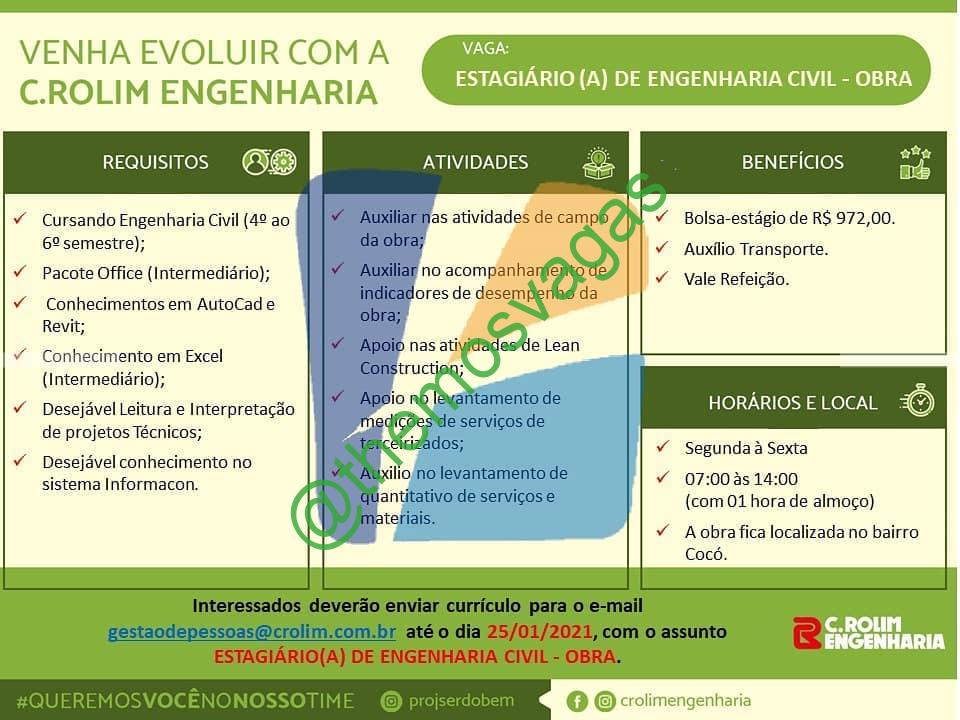 – Interessados(as) e que atendam ao perfil solicitado acima, devem enviar o currículo até 25/01 para o e-mail gestaodepessoas@crolim.com.br, contendo no título/assunto “Estágio de Engenharia Civil – FOR