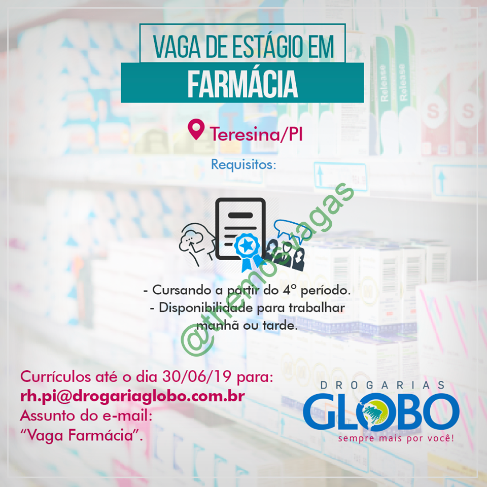 – Interessados(as) e que atendam aos requisitos devem enviar o perfil profissional até o dia 30/06/2019, colocando no título do e-mail “Vaga Farmácia”, para:  rh.pi@drogariaglobo.com.br