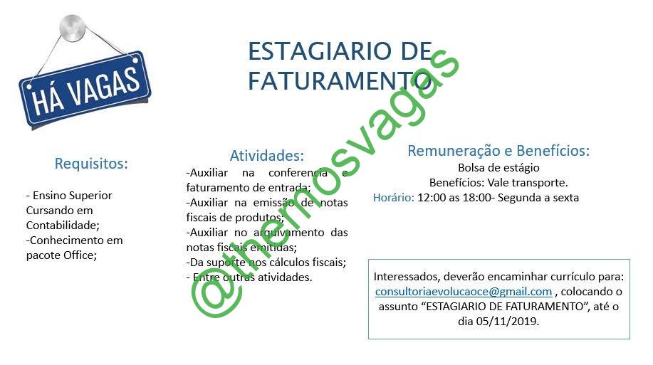 – Interessados(as) e que atendam ao perfil solicitado acima, devem enviar o currículo para o e-mail consultoriaevolucaoce@gmail.com até o dia 05/11/2019 , colocando no título “Estágio de Faturamento”.