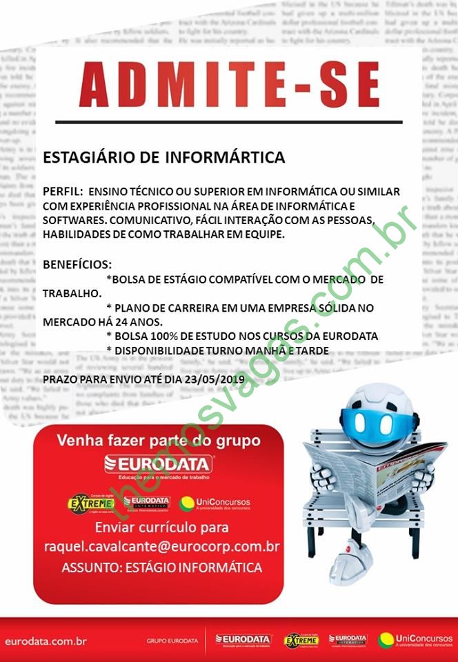 – Interessados(as) e que atendam aos requisitos devem enviar o perfil profissional até o dia 23/05/2019, colocando no título do e-mail “Estágio de Informática “, para: raquel.cavalcante@eurocorp.com.br