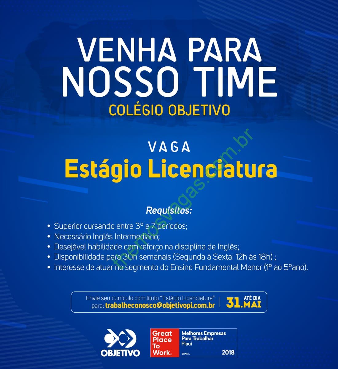 – Interessados(as) e que atendam aos requisitos devem enviar o perfil profissional até o dia 31/05/2019, colocando no título do e-mail “Estágio Licenciatura”, para:  trabalheconosco@objetivopi.com.br